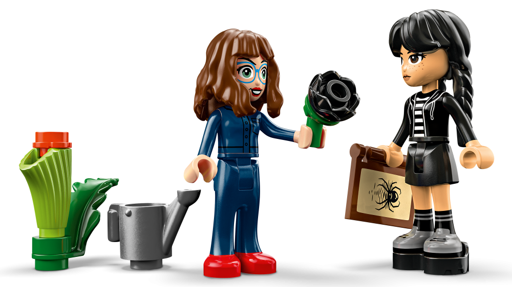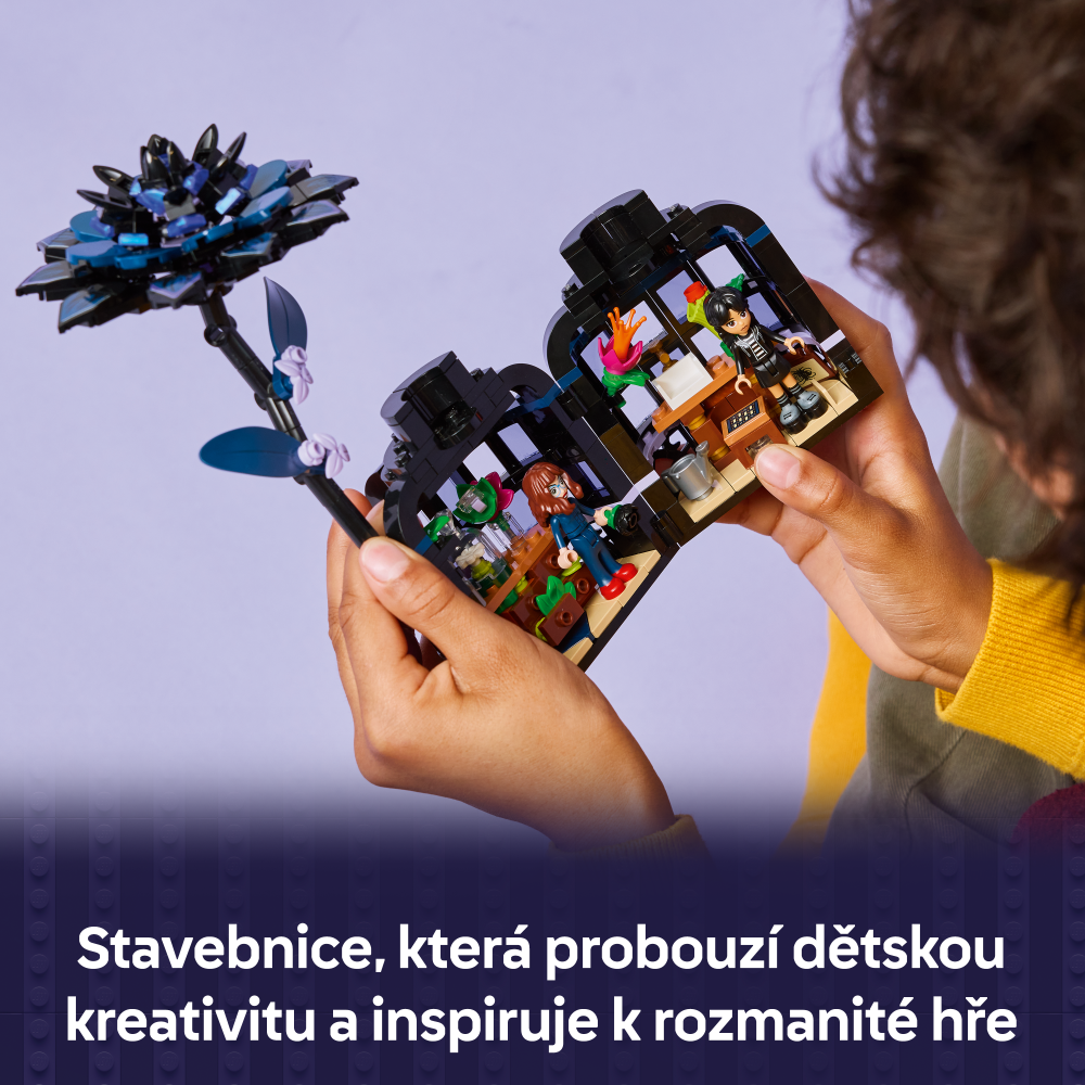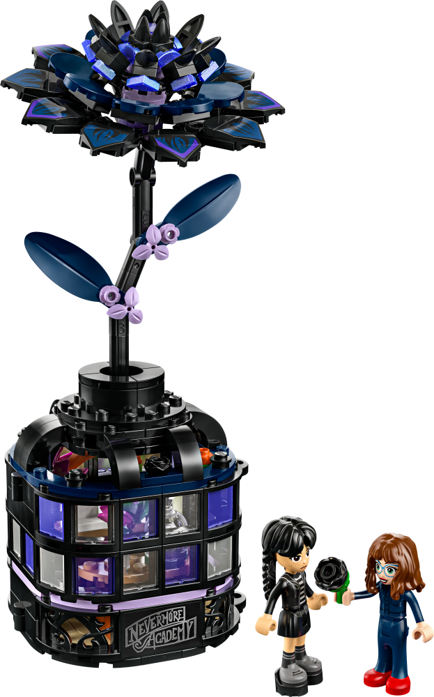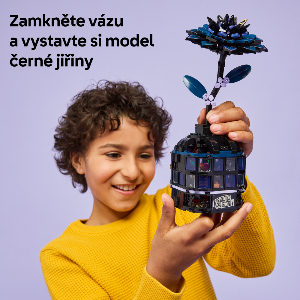 Stavebnice LEGO® Wednesday (76784) Černá jiřina představuje elegantní výstavní kousek pro milovníky botaniky a designu od 9 let. Tato bytová dekorace obsahuje černou jiřinu s listy a světle fialovými pupeny a vázu, která připomíná miniaturní zimní zahradu. Po sestavení můžou děti odejmout květ jiřiny, odemknout vázu a odhalit učebnu uvnitř, ve které najdou odnímatelné lavice, stoličku a další doplňky pro vyprávění příběhů. Součástí stavebnice jsou také minipanenky Wednesday Addamsové a profesorky Marilyn Thornhillové na hraní na postavy.