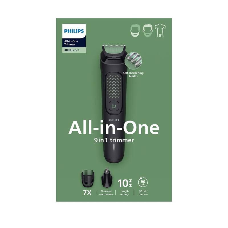 Multifunkční elektrický zastřihovač 9v1: 3 nástavce pro zastřihování vousů - 1, 2 a 3-7 mm; detailní zastřihovač vousů; 3 nástavce pro zastřihování vlasů 9, 12 a 15 mm; nástavec pro zastřihování chloupků v nose a uších. Všechny nástavce jsou omyvatelné. Mimořádně dlouho ostré samoostřící čepele. Výdrž: 60 minut. Příslušenství: cestovní pouzdro. Kód dodavatele: MG3945/15.